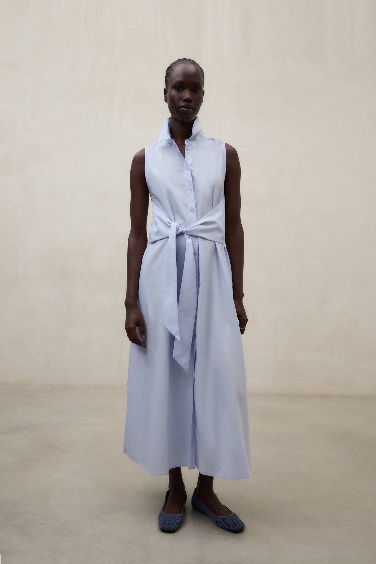 Das Kleid Chiara besteht aus einem Hauptgewebe aus 72 % TENCEL™ LYOCELL. Normaler Schnitt. Gürtel aus demselben Stoff. Frontverschluss mit Knöpfen. Seitentaschen.