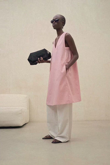 Das Kleid Francesca besteht aus einem Hauptgewebe aus 72 % TENCEL™ LYOCELL. Lockerer Schnitt. Ohne Ärmel und mit V-Ausschnitt. An den Seiten ist ein gerafftes Gummiband.