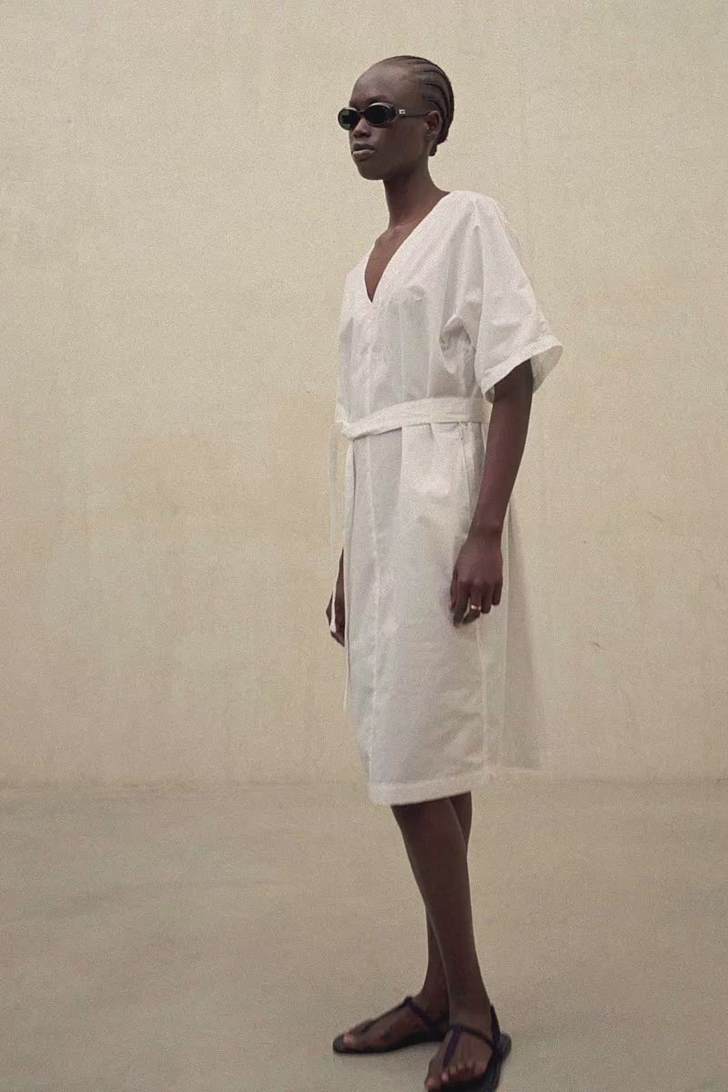 Das Kleid Ludovica besteht aus einem Hauptgewebe aus 100 % regenerativer Baumwolle. Oversize-Schnitt. Kimono-Ärmel. V-Ausschnitt.