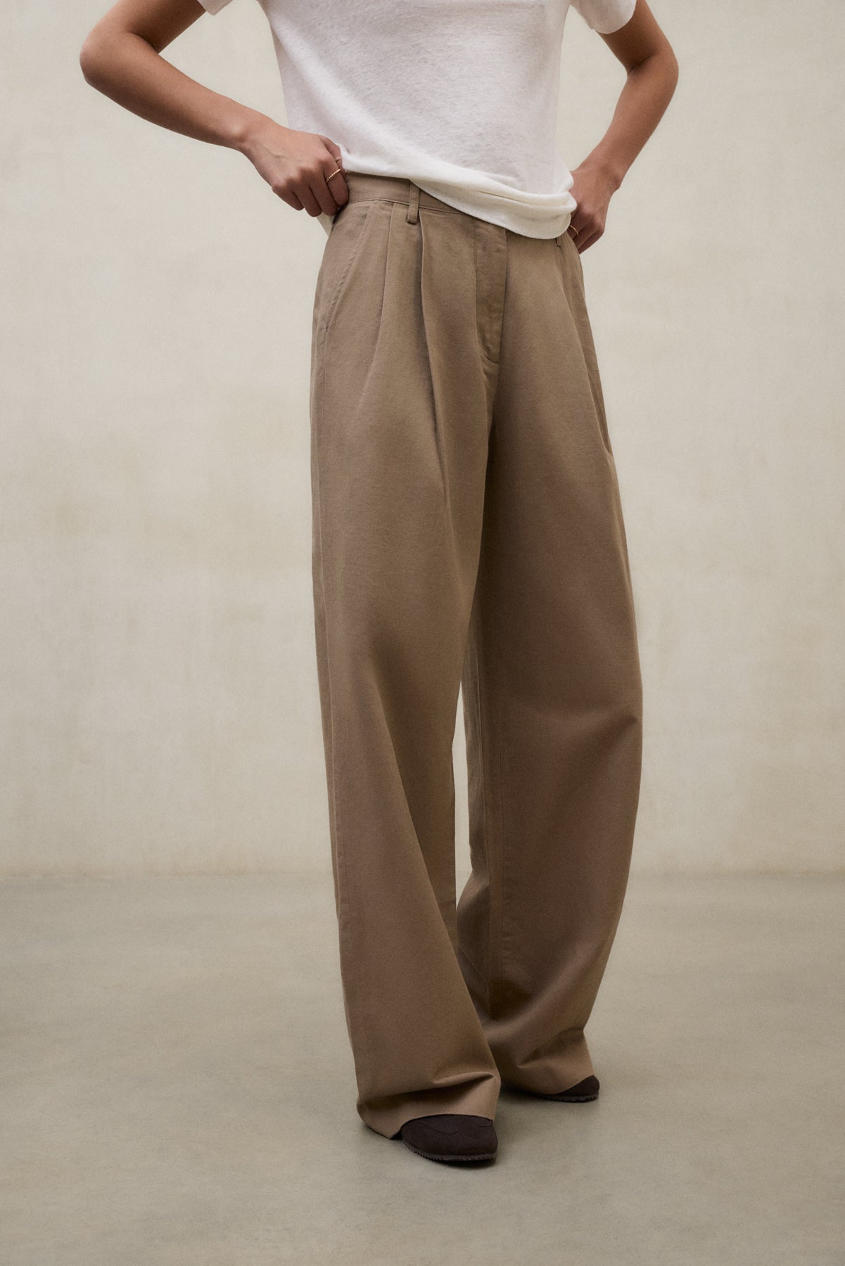 Die Leinenhose Miel besteht aus einem Hauptgewebe aus 61 % Bio-Baumwolle. Hoher Bund. Sie hat Falten auf der Vorderseite und Gürtelschlaufen. Sie verfügt über Seitentaschen sowie einen Verschluss mit Reißverschluss und Knopf an der Taille.