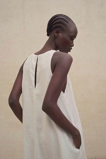 Das Kleid Ukara besteht aus einem Hauptgewebe aus 80 % Leinen. Lockerer Schnitt. Es ist ärmellos, hat einen Rundhalsausschnitt, eine mittlere Öffnung mit Knopfverschluss auf der Rückseite und eingesetzte Taschen in den Seitennähten.