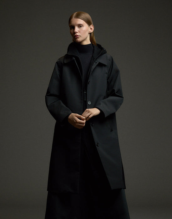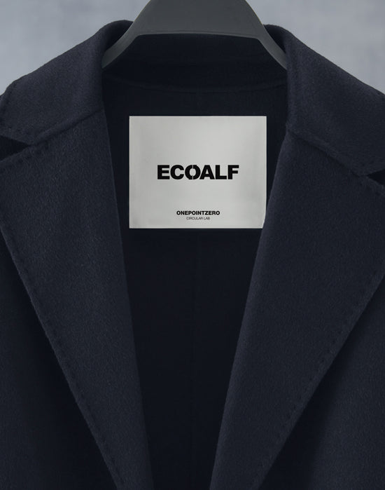 Empieza por retirar las etiquetas de poliéster 100 % reciclado cortando los hilos que las unen al abrigo (pueden reciclarse con la capa de poliéster sintético reciclado).