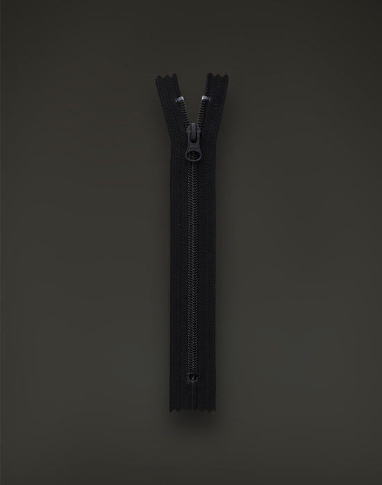 Corta siguiendo la cinta de la cremallera. La cremallera en su conjunto se ha confeccionado con poliéster reciclado teñido como si fuera una capa sintética (a excepción del tirador metálico que debe separarse y reciclarse de forma independiente).