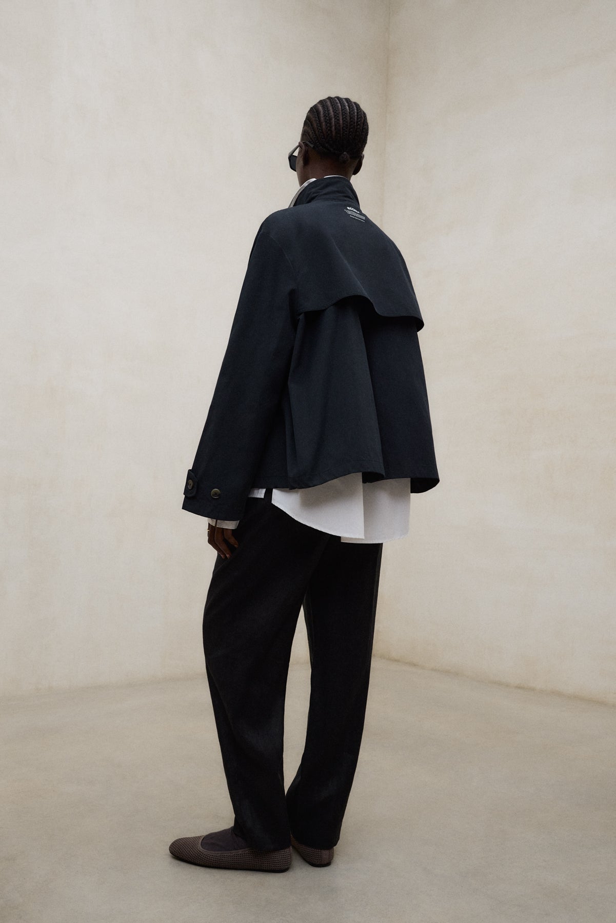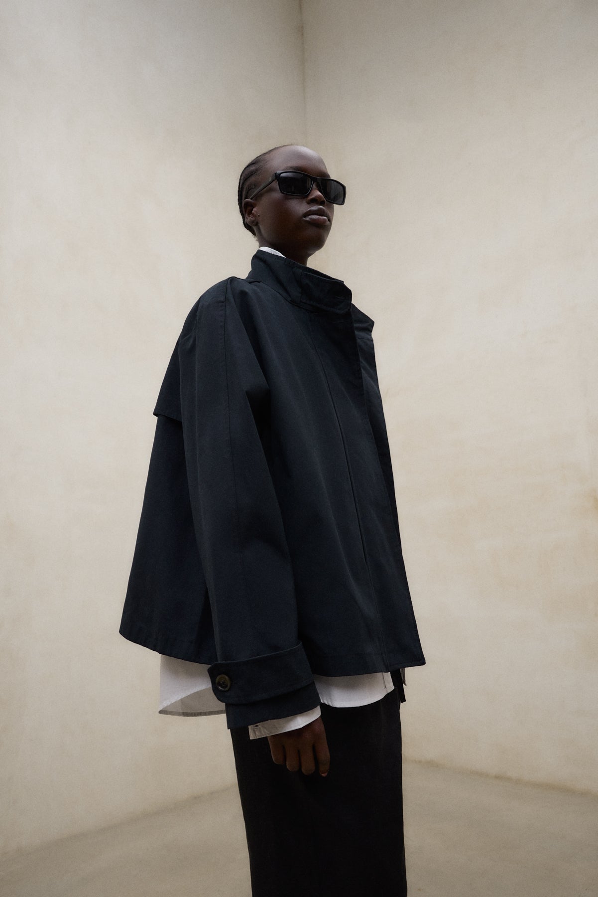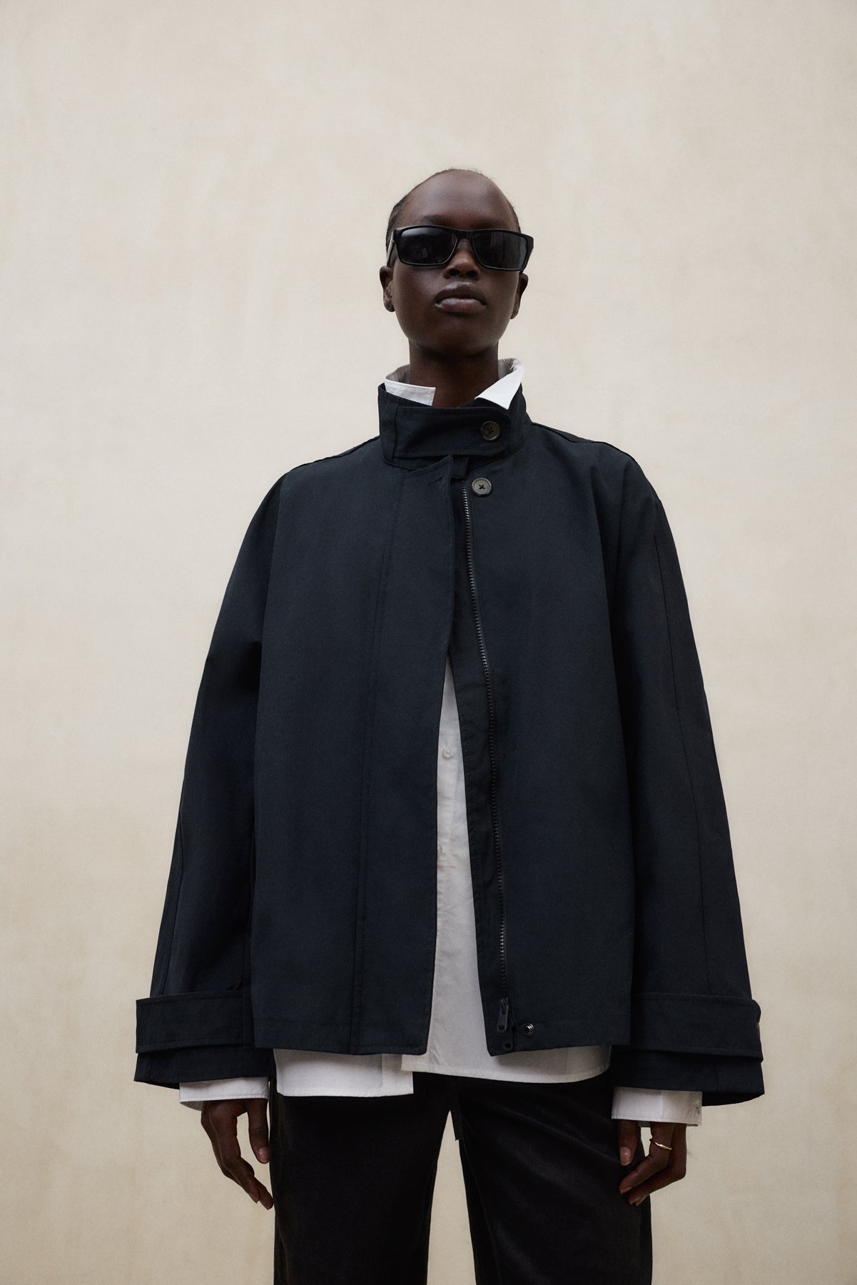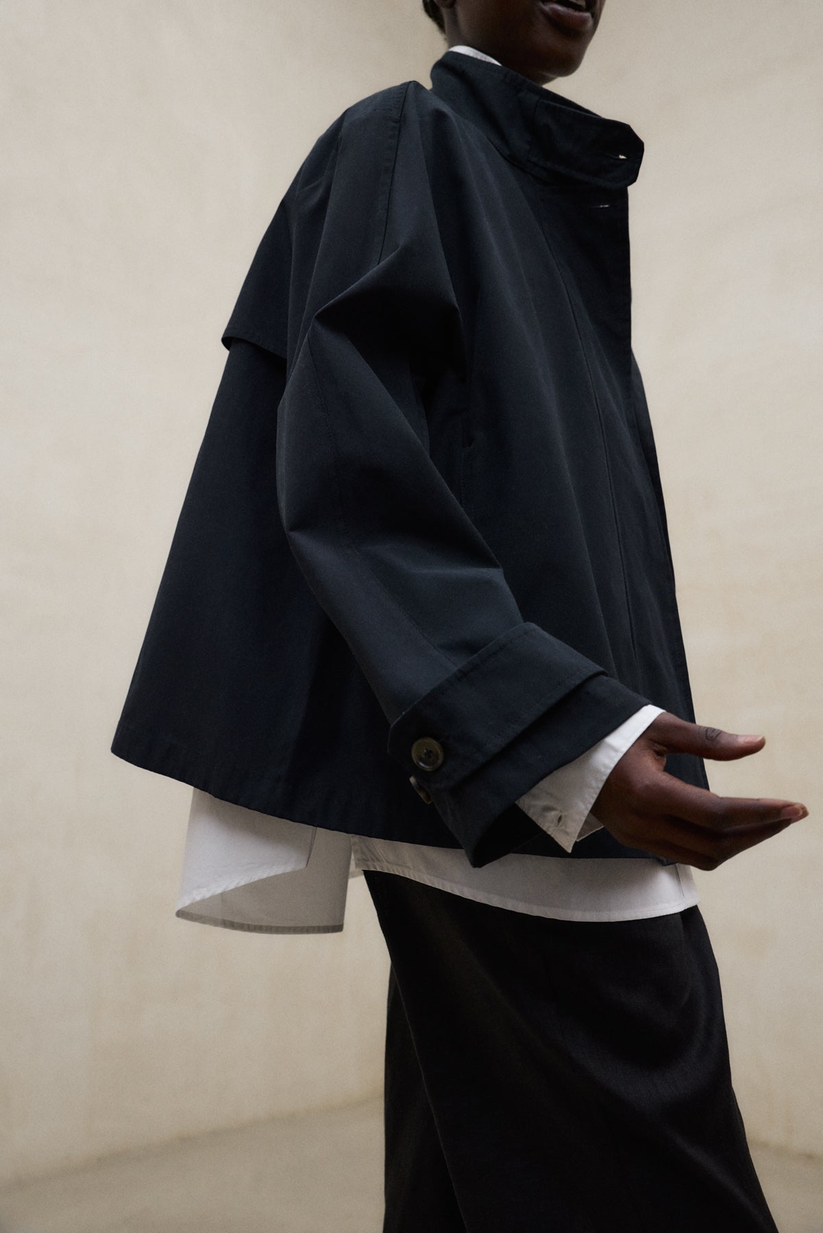 La Chaqueta Nebu está fabricada con un tejido principal de 54% Poliéster reciclado. Fit oversize. Cuello alto con cierre de botón. Bolsillos laterales. Puños ajustables. Pliegue en la espalda.