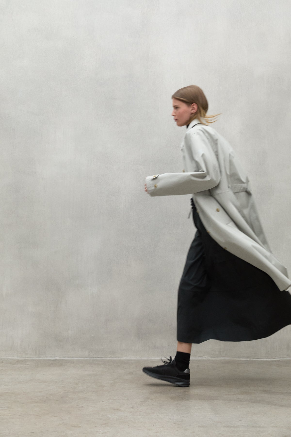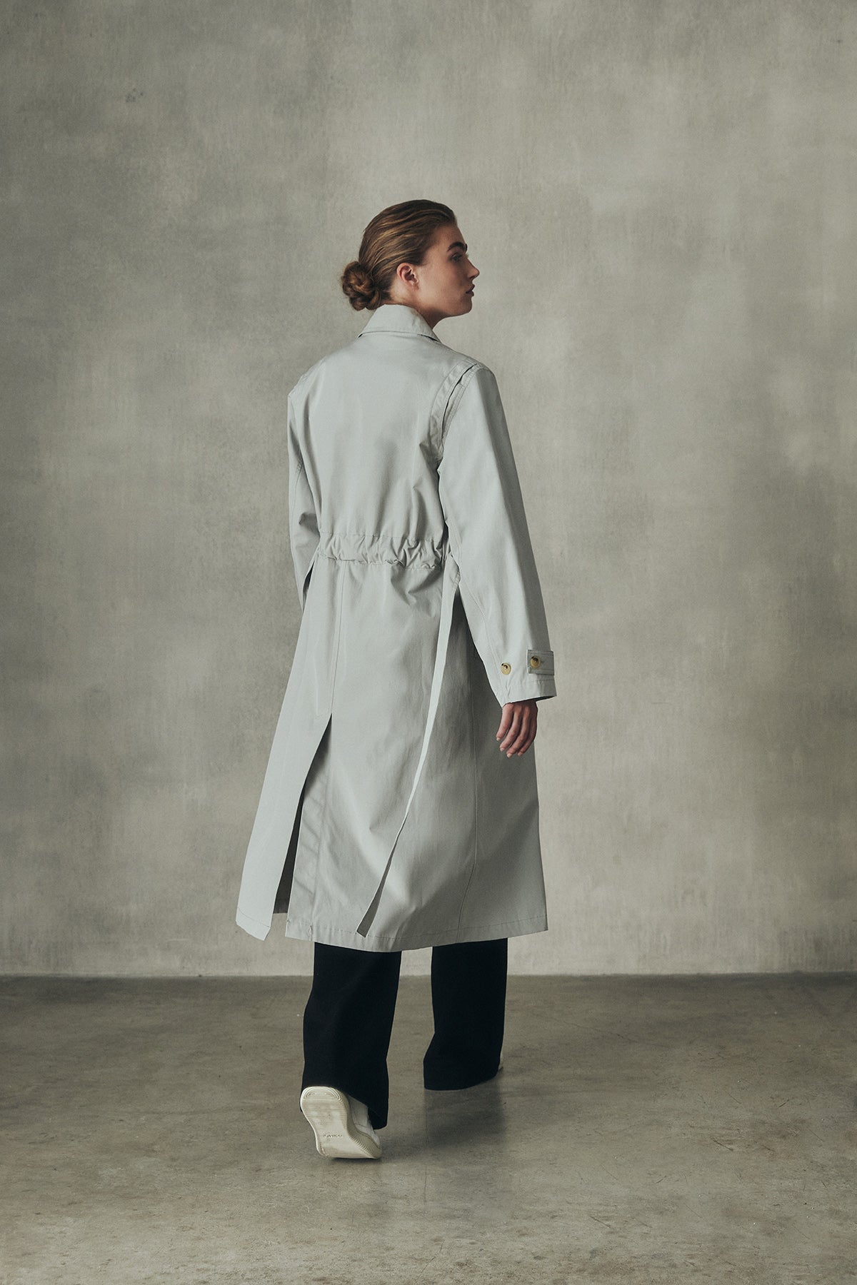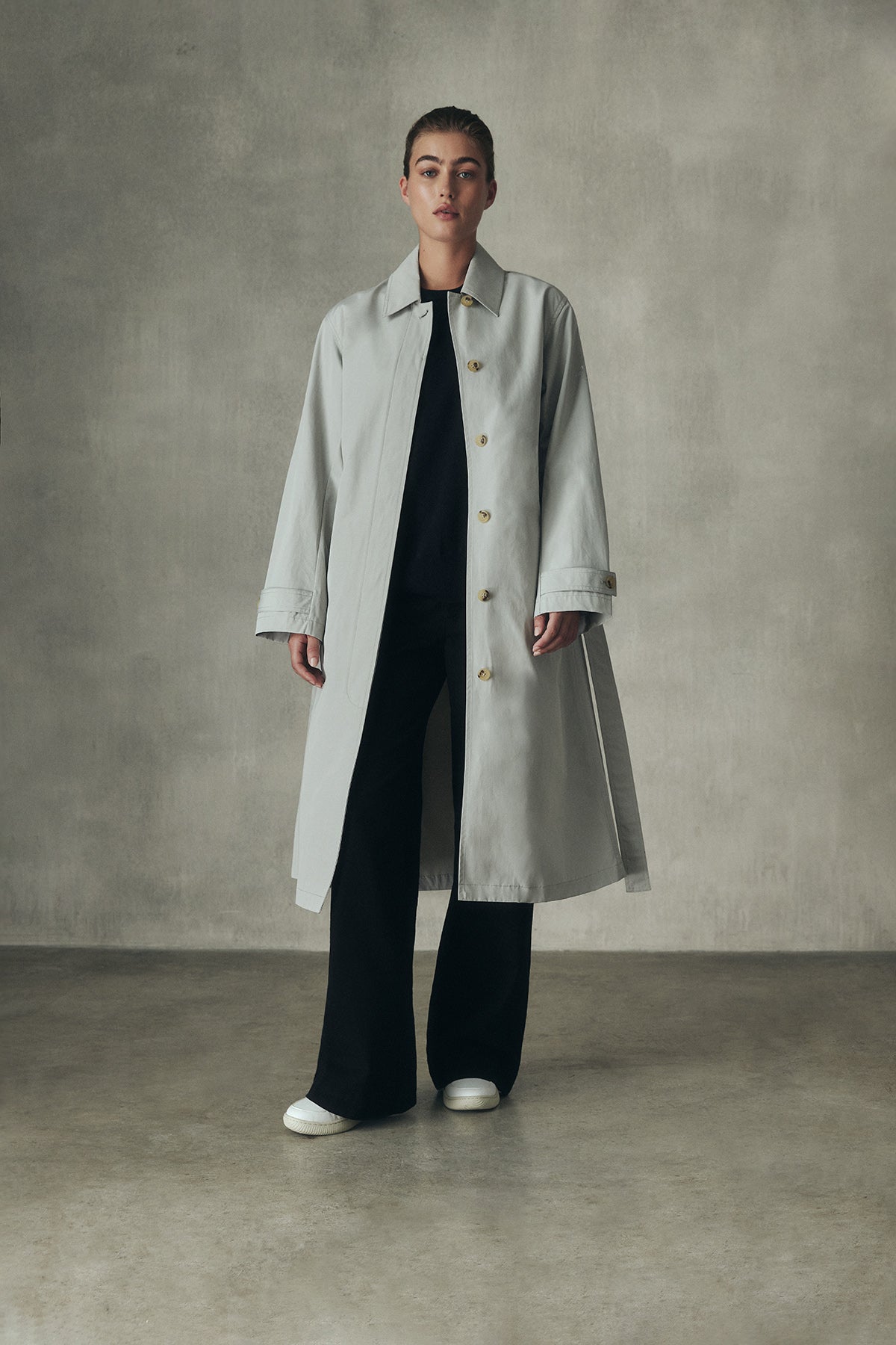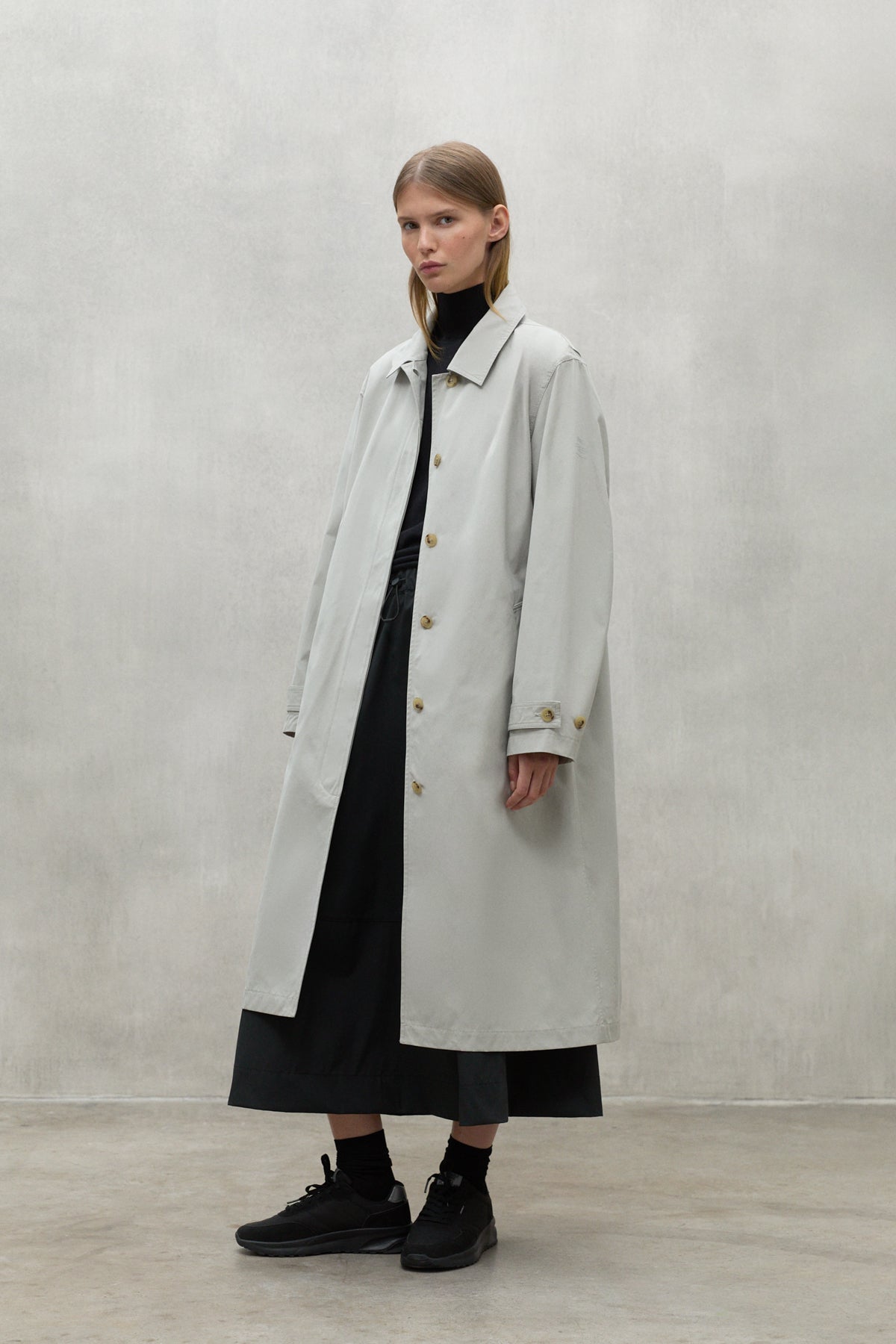 La gabardina Taga está hecha de 54% poliéster reciclado y 46% algodón orgánico, dos materiales sostenibles que promueven la economía circular. Es repelente al agua y tiene un cinturón para ajustarla a la cintura; una chaqueta muy elegante y atemporal.
