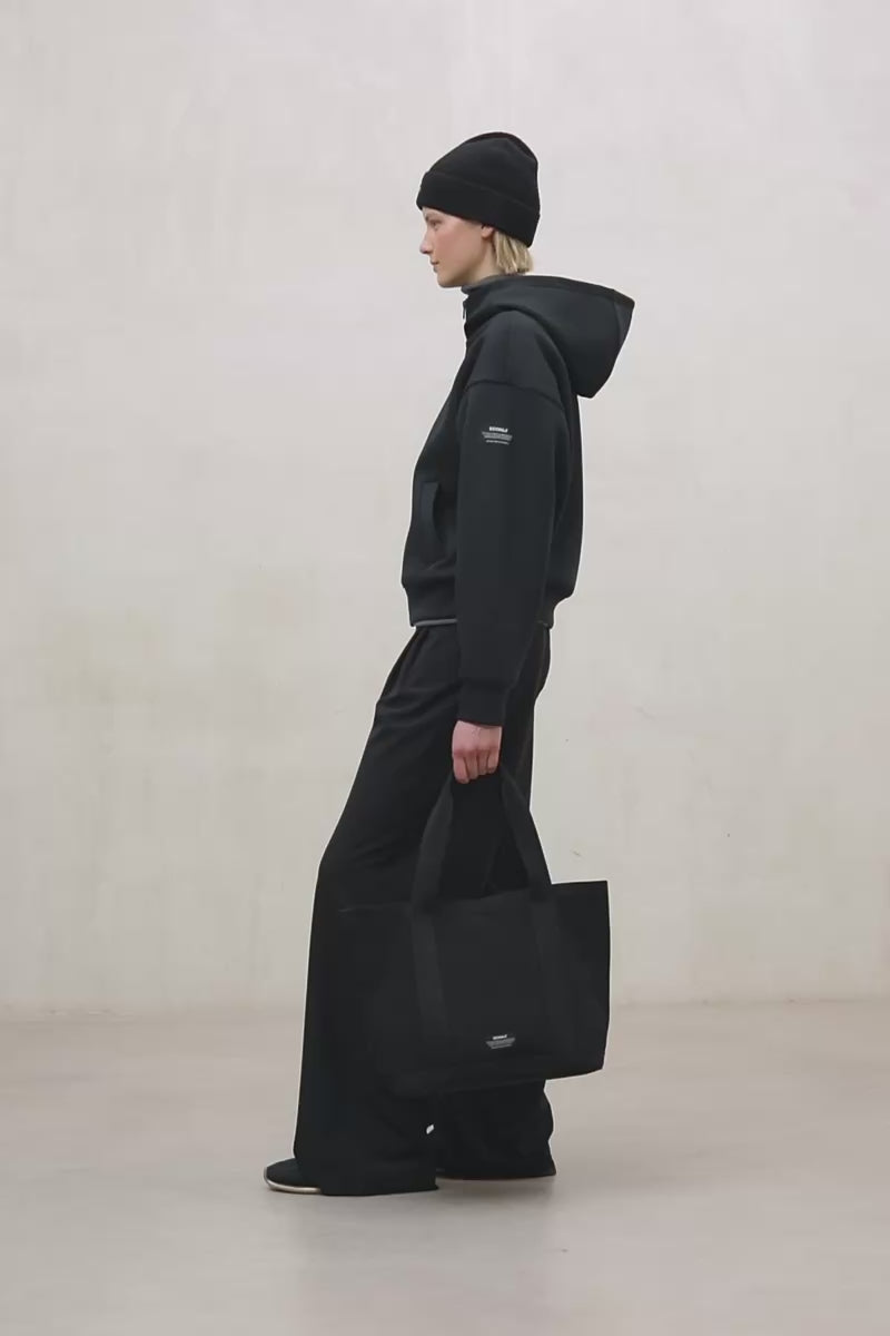 La felpa Arica è realizzata con un tessuto principale composto per il 75% da poliestere riciclato, per il 16% da viscosa e per il 9% da elastan. È foderata in 100% cotone biologico. Il poliestere riciclato riduce l'uso di risorse fossili, le emissioni di CO2 e il consumo di acqua ed energia riutilizzando i rifiuti plastici, come le bottiglie in PET, e mantenendo, al contempo, le proprietà del poliestere vergine.