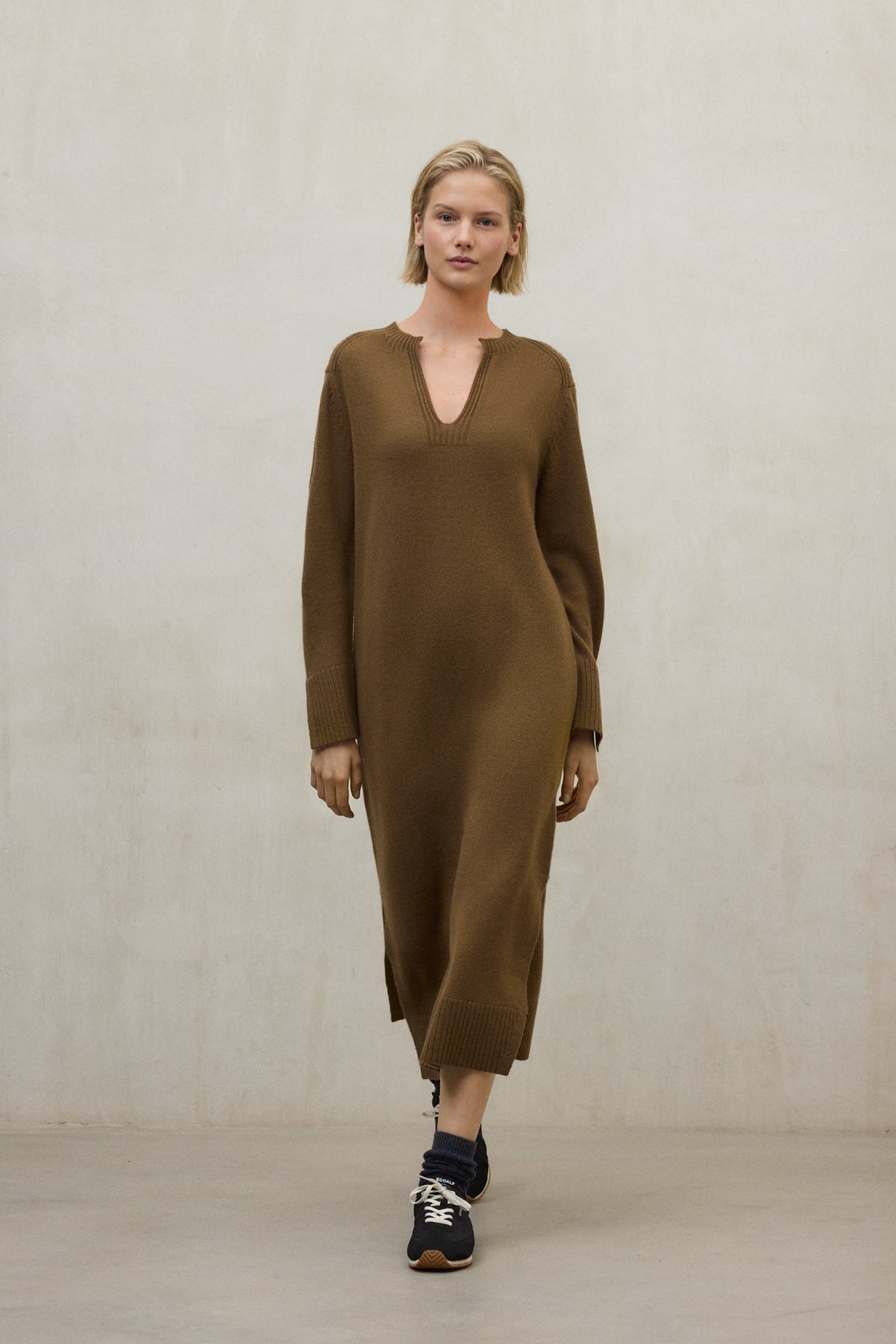 Un abito lungo in lana con scollatura aperta, perfetto per eventi eleganti nei mesi più freddi, quando si ricerca calore e raffinatezza.